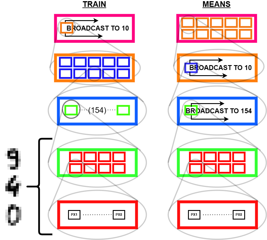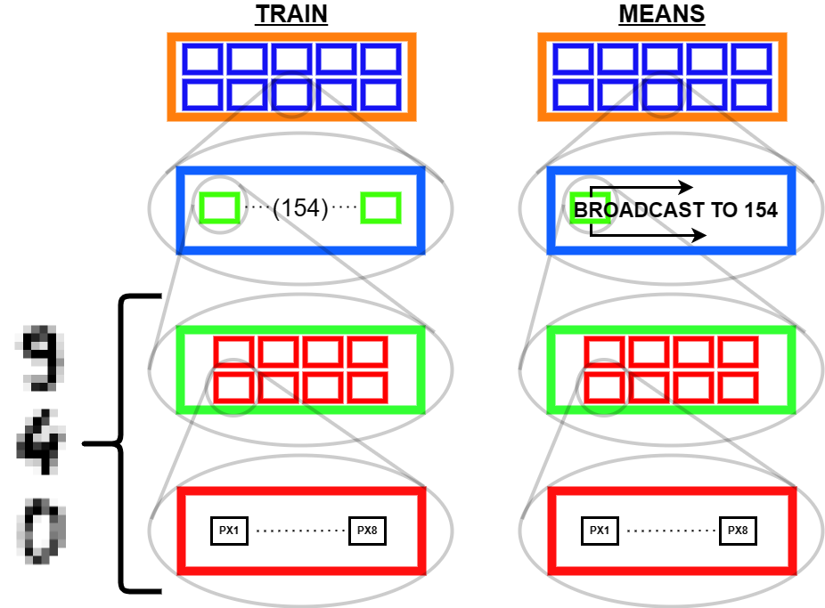 The result is that the 10,1,1,8,8 tensor and 1,10,154,8,8 tensors are broadcast to be equal in shape to perform computation. First in dimension 1, the train data is broadcast (10 copies created), in dimension 2 the mean data is broadcast creating 10 copies of everything below. Then in the 3rd dimension, the means is again broadcast up to 154, creating 154 more copies of what is in the dimensions below. In this way, the 1st dimension corresponds to the different ‘ideal’ or mean digits 0-9, the 2nd dimension corresponds to all the data corresponding to the training data for digits 0-9. The 3rd dimension differentiates between individual samples of a given training digit. And the 4th and 5th dimension get us to individual pixels of those images.