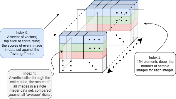 Picturing the 3D result as a cube, each element in the cube contains the numeric result from mnist_dist for the comparison of an ideal and a test image. Any given sample image is compared against all 9 ideal digits, and where the miniumum mnist_distance corresponds to the integer that the training digit actually is, the benchmark function was correct.